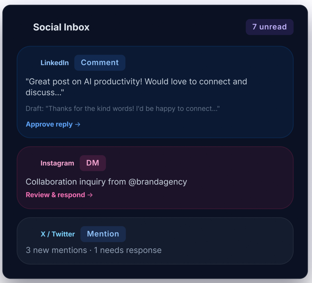 Omnis monitors LinkedIn, Instagram, X, Facebook, and YouTube — surfacing what actually needs your attention. It drafts replies and post suggestions, so you can respond faster without losing your voice.