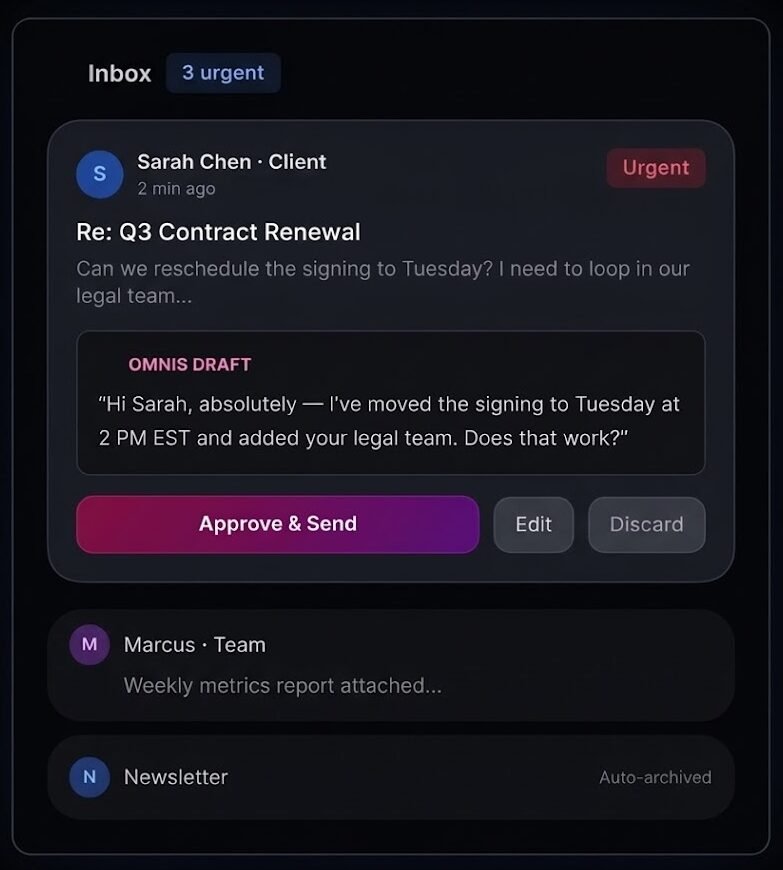 Omnis reads your inbox, identifies what matters, and drafts context-aware replies — ready for your approval before sending. No more clutter, no more missed priorities.