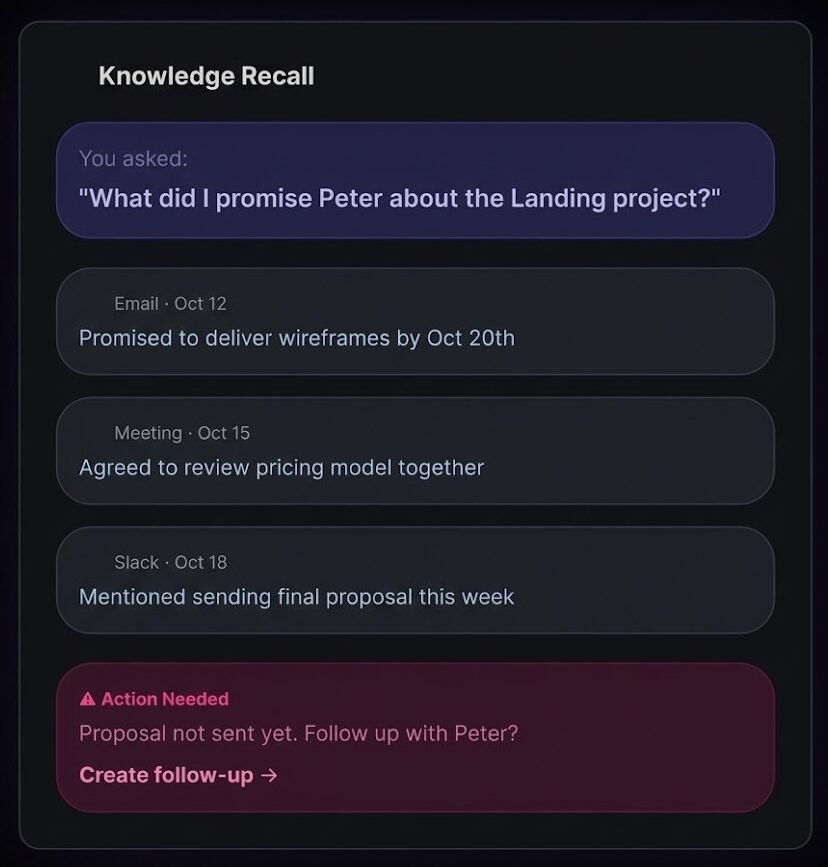 Ask Omnis anything about your past work. It searches across email, calendar, notes, and conversations to surface exactly what you need — instantly.