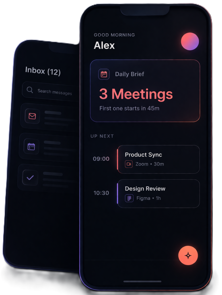 One system for email, meetings, tasks, approvals, travel, memory, and social coordination. Built for people who need clarity and control.